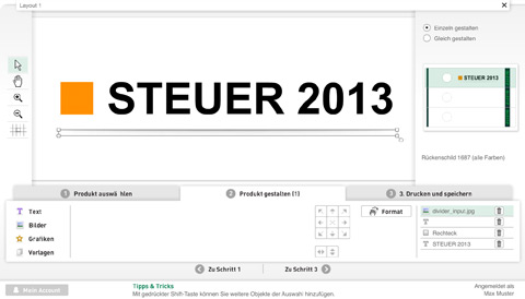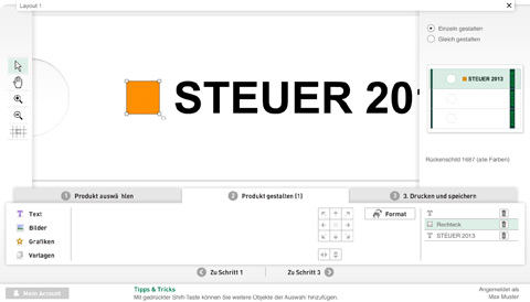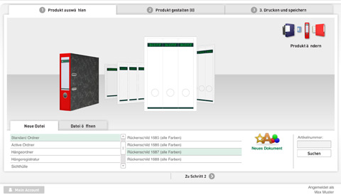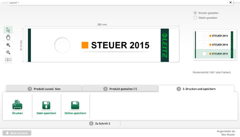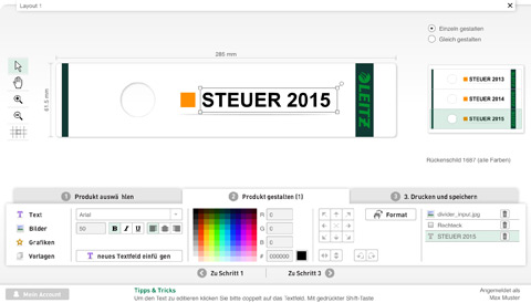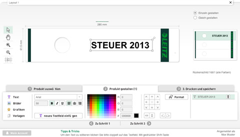 Mit dem Leitz easyprint Online-Etikettendesigner kann der Kunde in drei einfachen Schritten sein individuelles Etikett, wie im folgenden Beispiel ein Ordnerrückenschild, gestalten und drucken.Mit dem Leitz easyprint Online-Etikettendesigner kann der Kunde in drei einfachen Schritten sein individuelles Etikett, wie im folgenden Beispiel ein Ordnerrückenschild, gestalten und drucken.