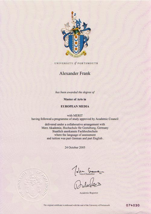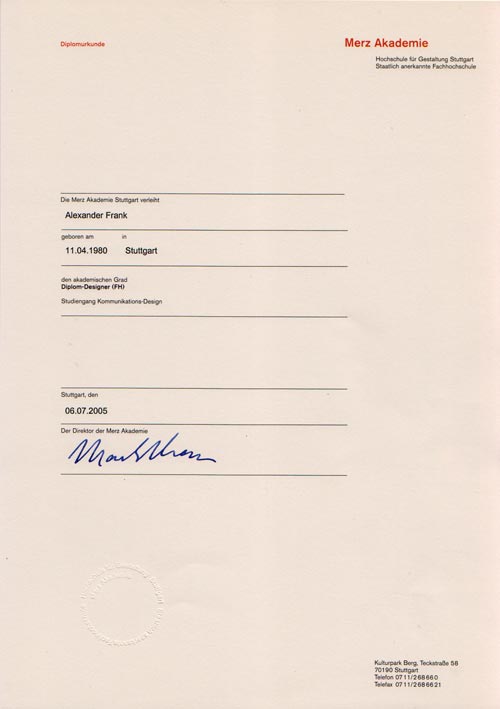 2001-2005 | Merz-Akademie Studium Kommunikationsdesign Abschluß: Diplom Kommunikationsdesigner FH (Note 1,7) Abschluß: Master of Arts in European Media (Note 1,3) |